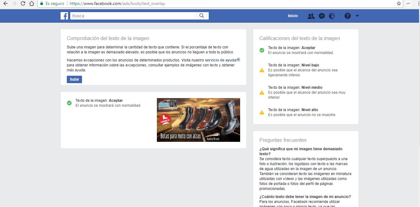 Text Overlay da solución a esto, ya que podemos saber si cumplimos con esta norma de Facebook antes de publicar el anuncio. Se accede desde éste link https://www.facebook.com/ads/tools/text_overlay y se utiliza de la forma que puedes ver en las siguientes imágenes: