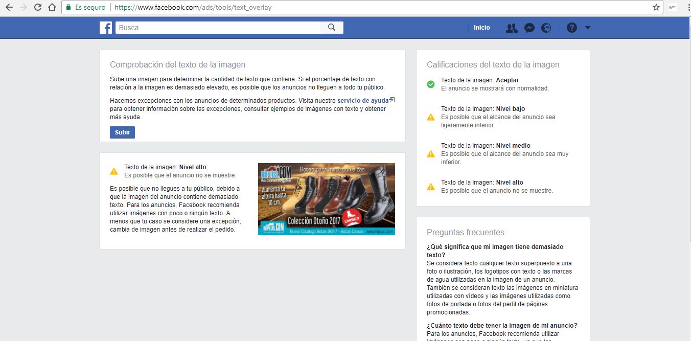 -Una vez subida la imagen, Facebook nos dá el resultado de si el anuncio se mostrará con normalidado o si sobrepasa el tamaño permitido de texto y de esta forma el anuncio posiblemente no se visualizará.